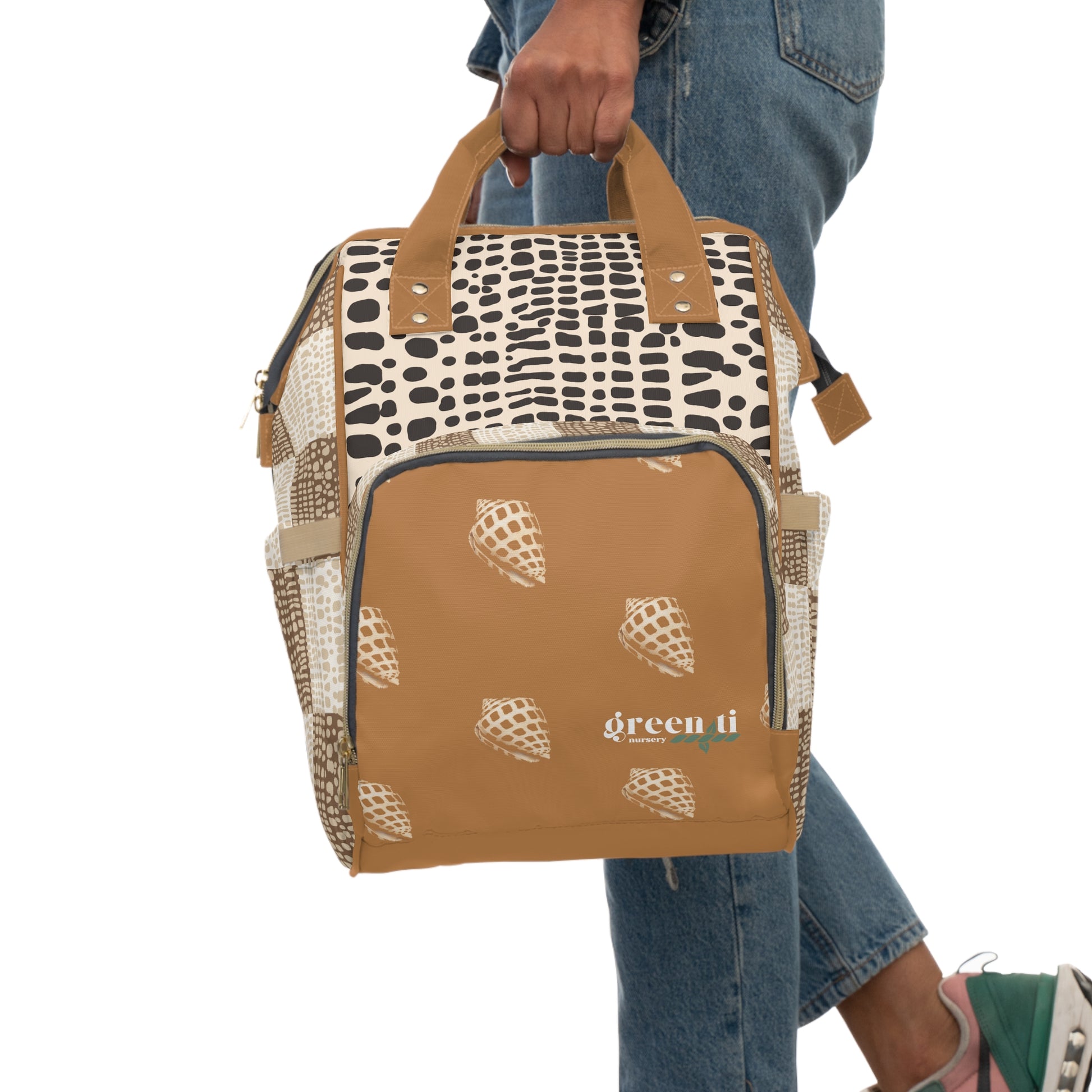 A roomy diaper backpack designed for the local girls and mamas who need hands-free organization without sacrificing style with this unique cone shell print patchwork bag.